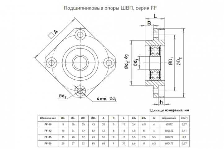 Опора для фиксации конца винта ШВП диаметром 10 мм, с фланцем. В опоре установлен радиальный подшипник, фиксирующий винт и воспринимающий в основном радиальные нагрузки. Опоры серии FF - плавающего типа, и не рассчитаны на большие осевые нагрузки. Рекомендуется при креплении винта ШВП совместно с плавающими опорами использовать фиксирующую опору типа BK или FK.