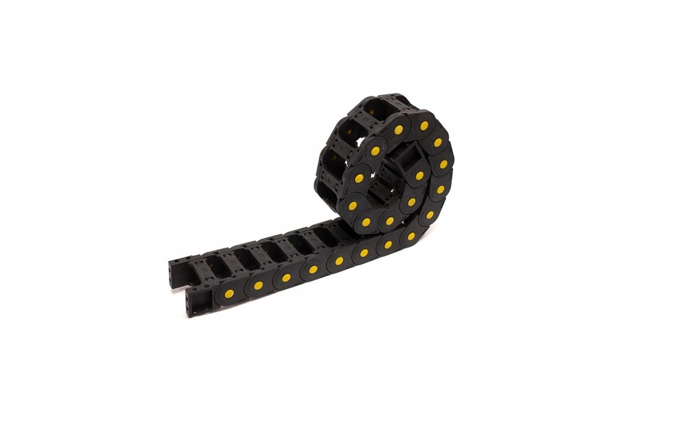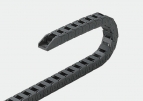 Кабельный канал открытого типа из негорючего черного нейлона. Гибкие кабельные каналы 25х57 используются в системах кабельной защиты оборудования, для построения гибких кабельных цепей, прокладки коммуникаций к движущимся узлам механизмов, роботов, порталам станков с ЧПУ, ворот и др. Большое сечение кабель-канала позволяет уложить дополнительные коммуникации для сложного и крупногабаритного оборудования.